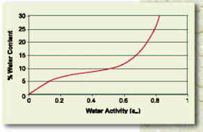 什么是水活性 水活性事實上與平衡相對濕度含義一致,但它不是以 0…100%RH 標志 , 而是以 0….1.0 Aw 標志。平衡濕度定義為沒有了物質與空氣中水的交換情況下,由周圍空氣獲取的濕度值。 為什么要測量水活性 水活性影響物質物理、機械、化學、微生物特性,這些包括流量特性、凝聚、內(nèi)聚力和靜態(tài)現(xiàn)象。食物上架壽命、顏色、味道、維生素、成分、香味的穩(wěn)定性;霉菌的生成和微生物的生長特性都能直接受水活性值影響。 水活性是一個直接影響食品保質期的臨界因素,溫度、 pH 值和其他一些因素會影響食物中有機體的可能的增長及增長率,然而,水活性通常是最有影響力的一個因素。如果我們能測出食物中水活性我們就能預知哪種微生物是導致食物腐敗的潛在原因,并能分檢出來。讓我們考慮一下水活性值為 0.81 的蛋糕,其保質期為 2 1 ℃時 24 天。如果水活性提高到 0.85 ,這些指標將降低為 2 1 ℃ 時 12 天。這表明是水活性決定了微生物生長率。 . 水活性值和細菌繁殖 aw = 0.91 … 0.95 細菌最多 aw = 0.88 酵母最多 aw = 0.80 霉菌最多 aw = 0.75 喜鹽細菌 aw = 0.70 osmiophile 酵母 aw = 0.65 xerophile 霉菌 用等溫吸附線解釋一下水份含量和水活性 水份指固體物質中水的重量百分比,它和水活性之間存在著如右圖(等溫吸附線)的關系,如果有條件,在一個固定溫度下,對同一種材料進行水活性和水份的全面測試,這個圖是唯一的,兩者之間是對應關系,但事實上,很多天然原料和食品的成分、化學性質都不可能完全一致,如果關心的是水的比例,則測量水分,如果關心物質對水的吸附和同外界的交換情況則測水活性,我們的水活性設備使用方便,不論在現(xiàn)場還是在實驗室。 |